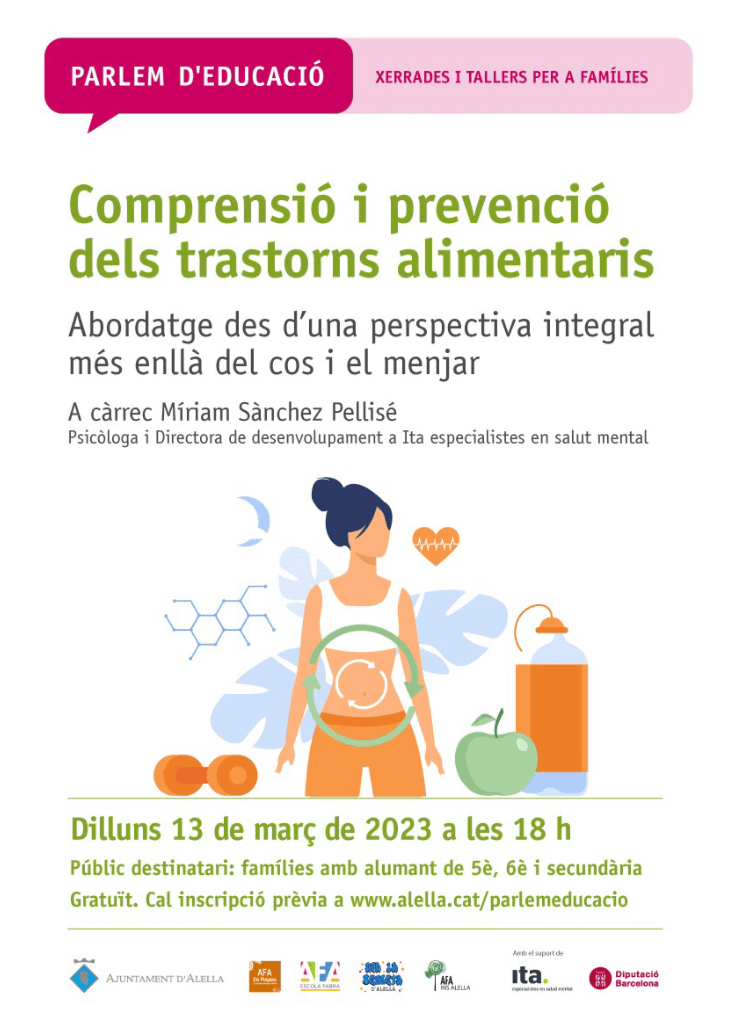 Des de la Comissió de Xerrades de les AFA d’Alella conjuntament amb l’Ajuntament, us convidem a assistir a la xerrada: Comprensió i prevenció de trastorns alimentaris, des d’una perspectiva integral més enllà del cos i del menjar.