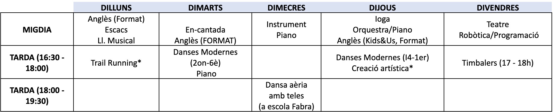 Durada: a partir del mes de setembre fins al juny (també durant la jornada intensiva)
